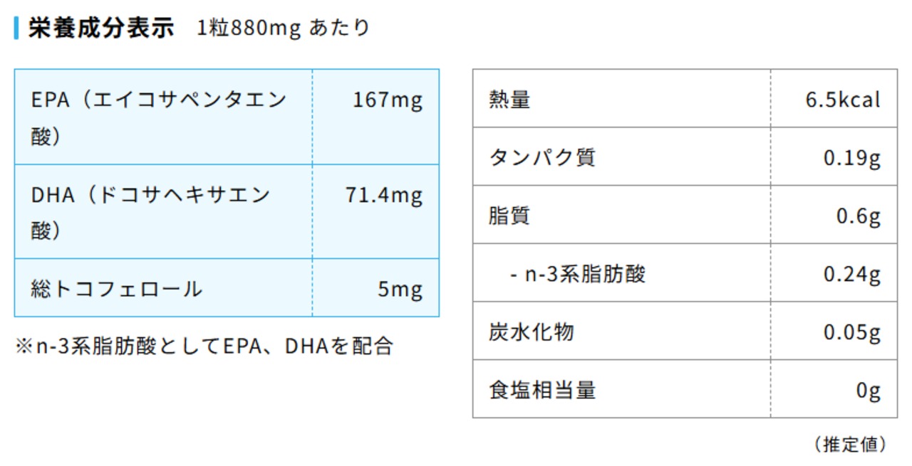 原材料:EPA・DHA含有精製魚油(国内製造)、ゼラチン/グリセリン、酸化防止剤(ビタミンE)